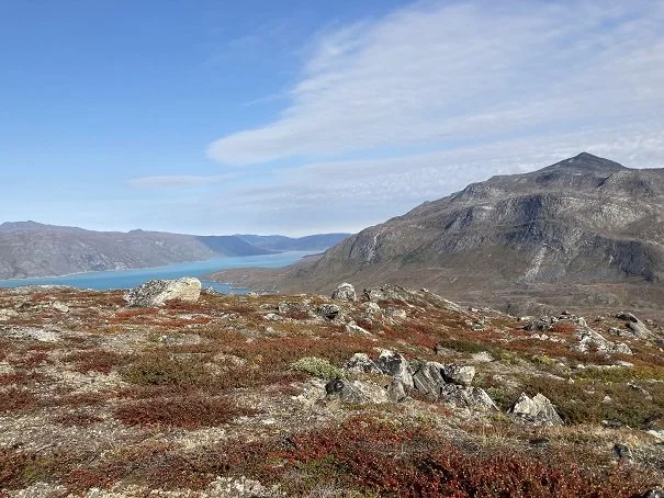 Først skulle vi op ad en stejl stigning op til 100 meters højde, hvor der er en terrasse, der går langt ind. Heroppe standsede vi op for at puste ud og se os om. I kikkerten kunne jeg se et rensdyr gå på fjeldskråningen til højre halvanden kilometer væk. Vi så på skråningen lidt, men vi så ikke andre. Det så ikke ud til at være særligt stort, men det var jo et rensdyr, så vi begyndte at gå i den retning.